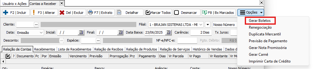 Ao marcar essa opção, o usuário passará a ter permissão para gerar boletos diretamente na tela de Contas a Receber, conforme as regras de segurança definidas.