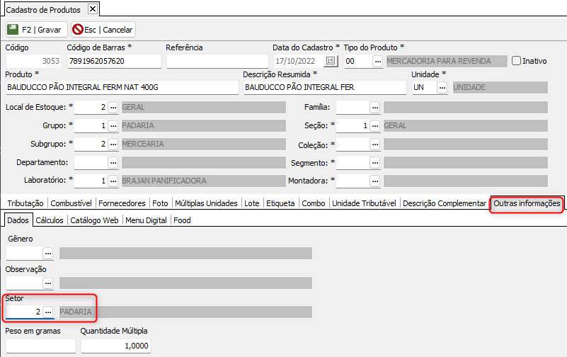Foi adicionado o campo "Setor" na aba "Outras Informações" do cadastro de produtos.