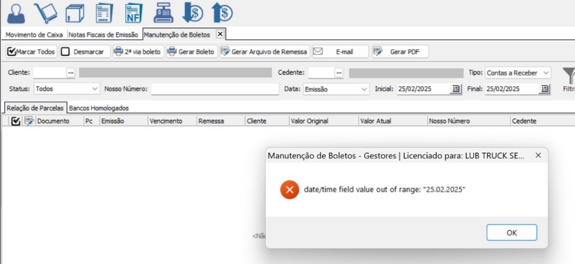 Troque 'mdy' por dmy, com isso o formato da data ficará como Dia.Mês.Ano, não ocorrendo mais o erro ao abrir as abas do sistema.