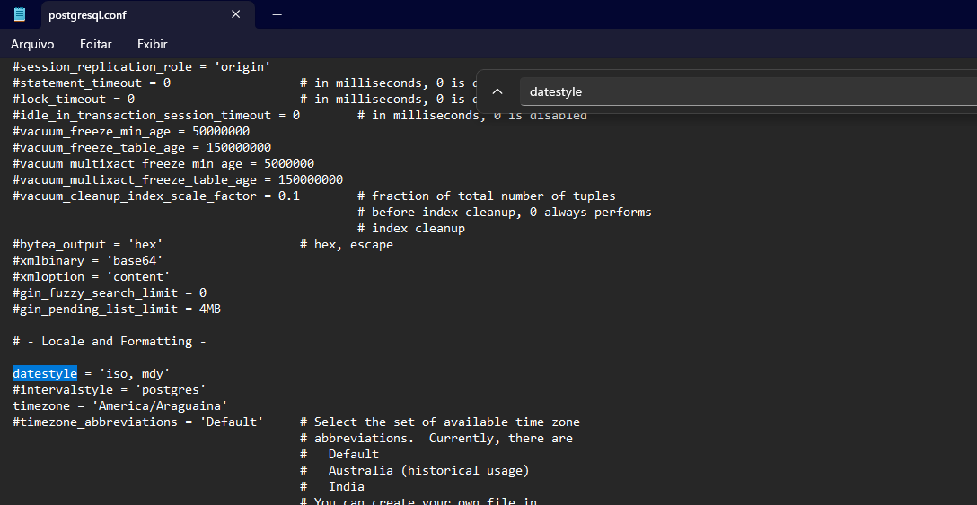 C:\Program Files\PostgreSQL\12\data na pasta postgres.conf pesquise por datestyle = 'iso, mdy'.