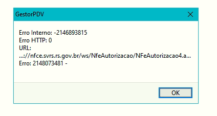 Erro Interno: -2146893815 Erro HTTP: 0 URL: https://nfe.svrs.rs.gov.br/ws/NfeAutorizacao/NFeAutorizacao4.asmx Erro: 2148073481 -