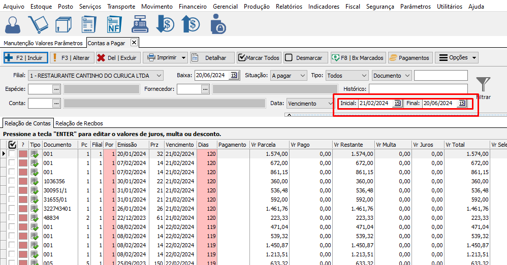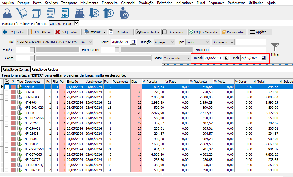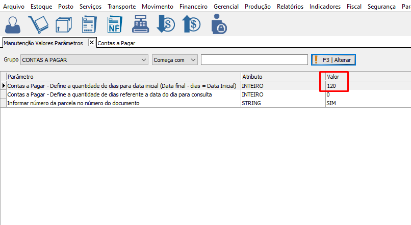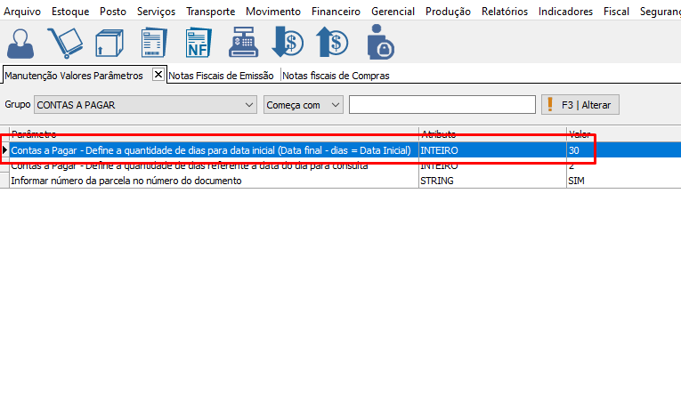 Define a Quantidade de dias para trás que vai buscar no filtro de contas a pagar. Define o período de dias do filtro. Exemplo 30 dias. |