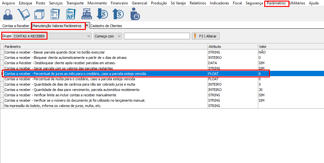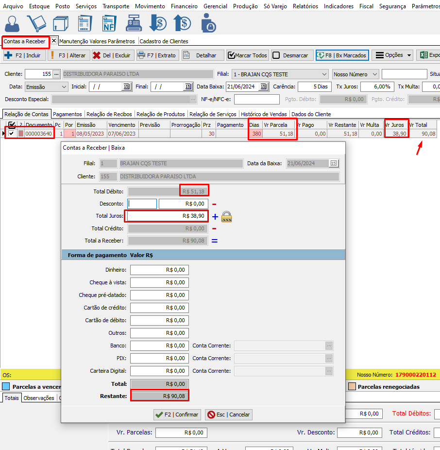 Configurando o parâmetro com o percentual de juros para cobrar após o vencimento. Ao cobrar a parcela, os juros, será incluído na cobrança.