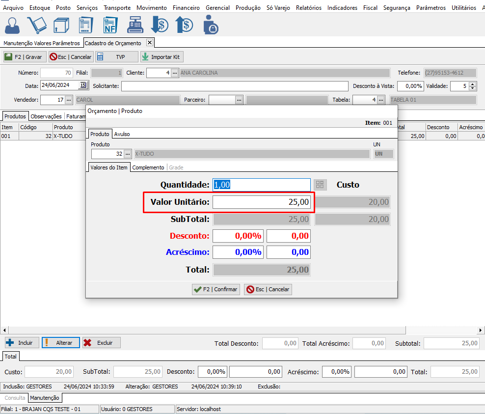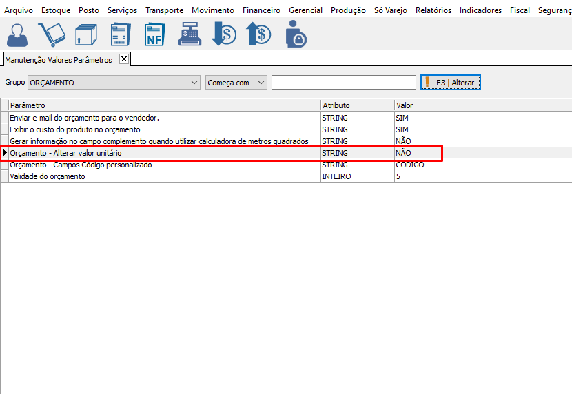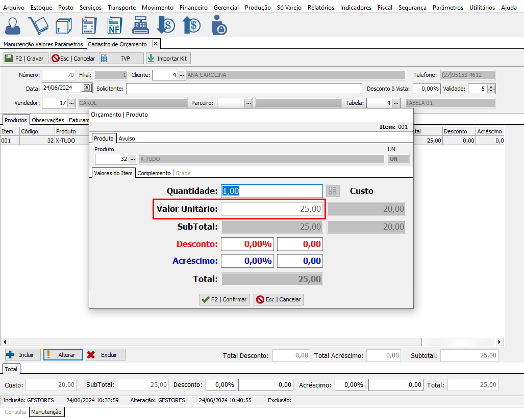 Parâmetro: [ORÇAMENTO] Orçamento - Alterar valor unitário