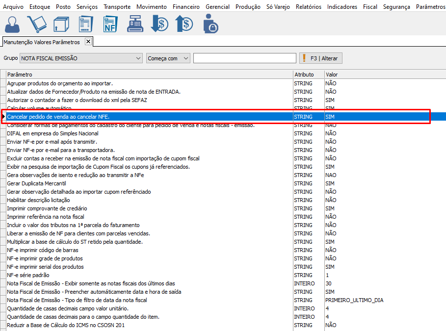 Parâmetro: [NOTA FISCAL EMISSÃO] - Cancelar pedido de venda ao cancelar NFE