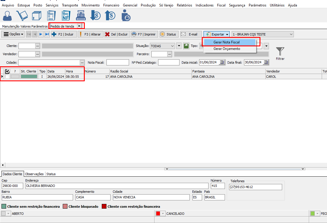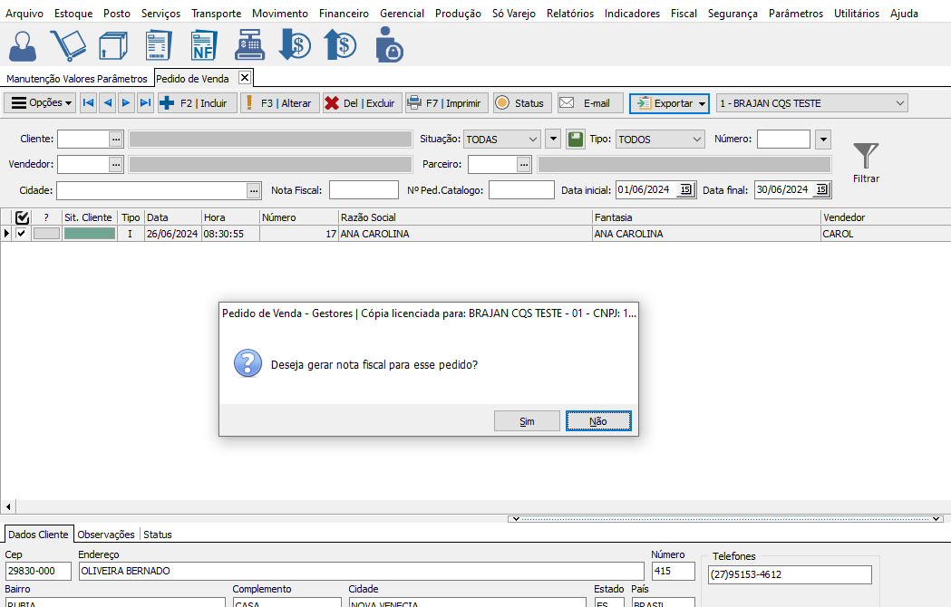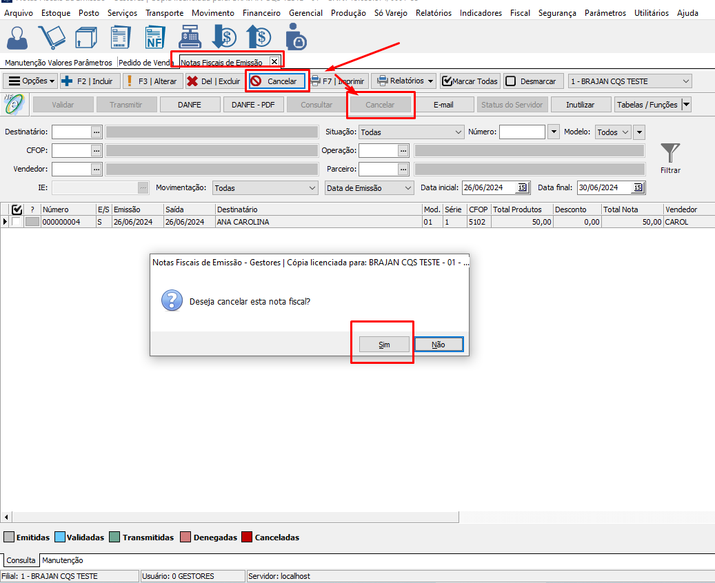 Com a nota fiscal já criada caso precise cancelar, o pedido de venda também será cancelado.
