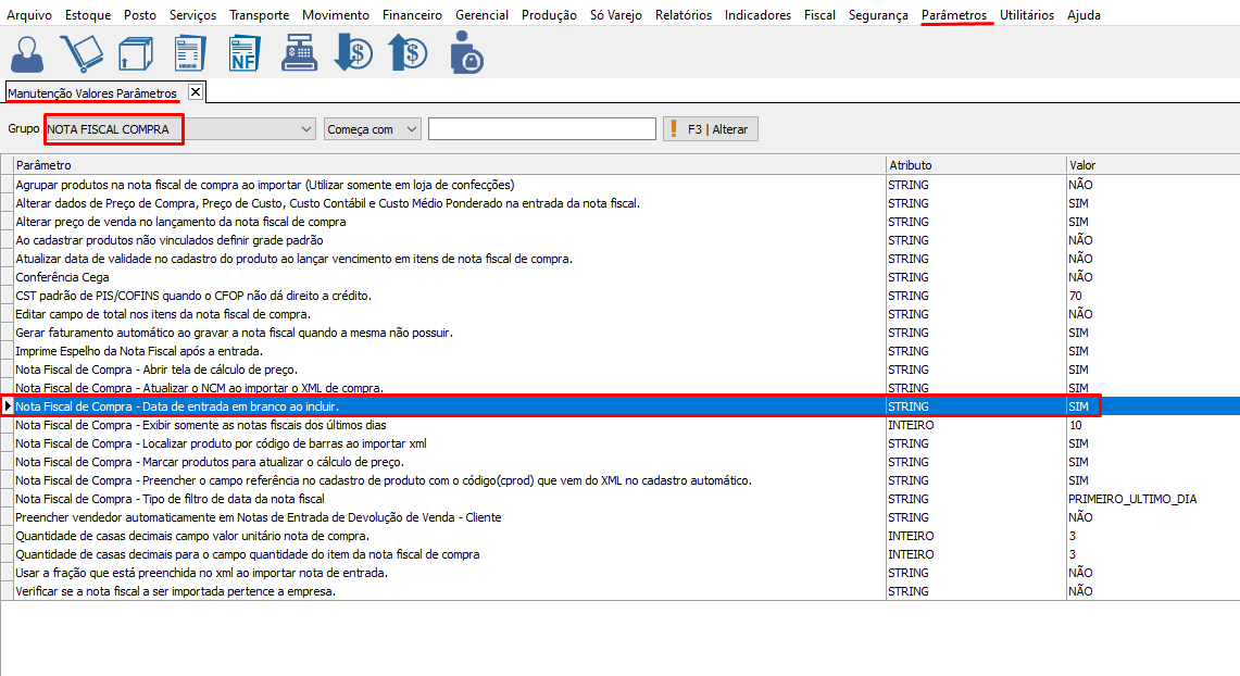 Ao incluir uma nota fiscal a data de entrada estará em branco segundo o parâmetro [SIM].