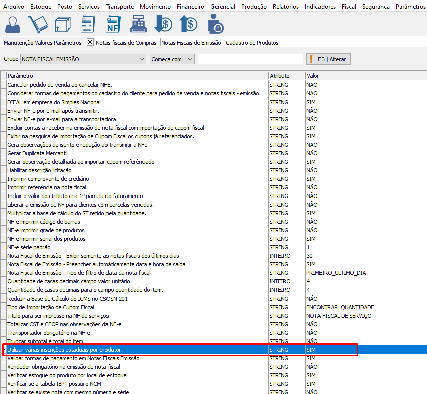 Parâmetro: [NOTA FISCAL EMISSÃO] Utilizar várias inscrições estaduais por produtor.