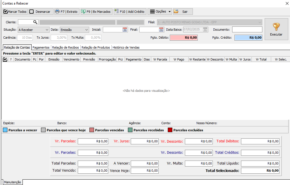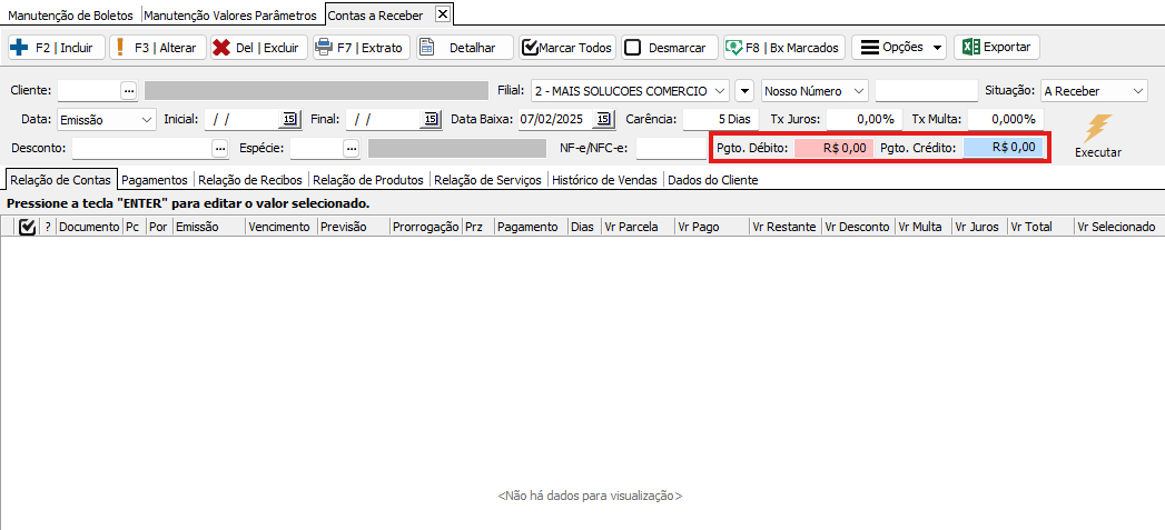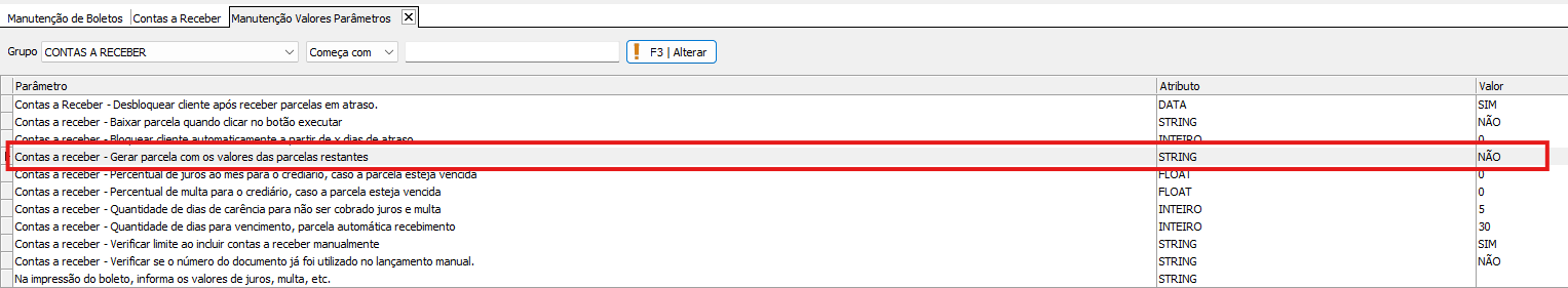 Em Parâmetros > Parâmetro Valor > Contas a receber: