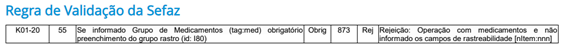 Quando for emitida uma NF-e (modelo 55) e informado um produto com Grupo de Medicamentos haverá a rejeição pelo motivo 873 - Operação com medicamentos e não informado os campos de rastreabilidade [nItem:nnn].