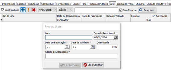 Estoque -> Produtos -> Cadastro de Produtos -> Lote