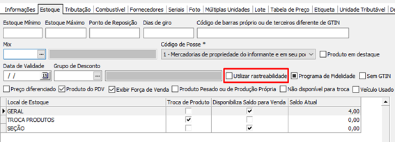 Estoque -> Produtos -> Cadastro de Produtos - > Estoque: Marque o parâmetro “Utilizar Rastreabilidade”.