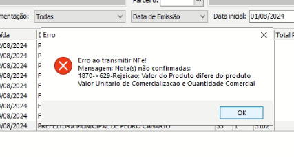 1870->629-Rejeicao: Valor do Produto difere do produto Valor Unitario de Comercializacao e Quantidade Comercial