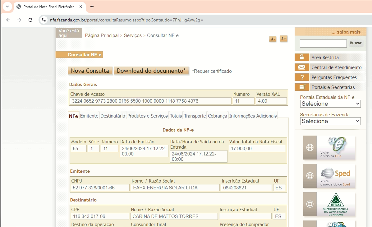 Confira as abas (NF-e, Emitente, Destinatário, Produtos e Serviços, Totais, Transporte, Cobrança, Informações Adicionais.