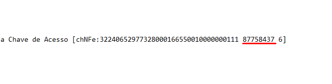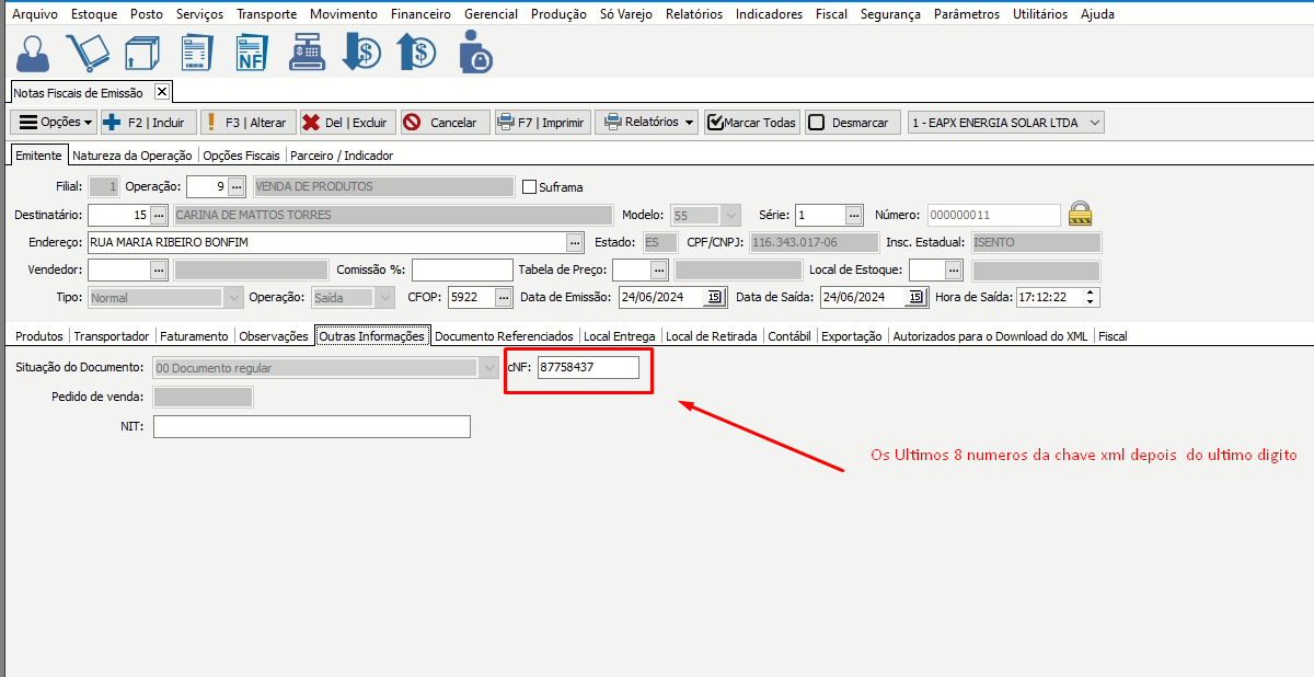 - Retornando ao sistema, será necessário alterar a nota na Aba “Outras Informações” o código da Nota (cNF) que pode ser encontrado na chave correta da nota contando da seguinte forma: A partir do penúltimo dígito da chave (pular o último), contar 8 números (de trás para frente).