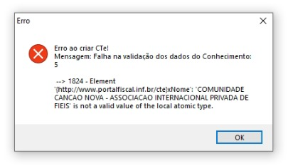 Em cadastro de pessoas, altere o nome referente para corrigir o erro diminuindo a nomenclatura de modo que não fique muito extensa, sendo possível assim validar o CTE.