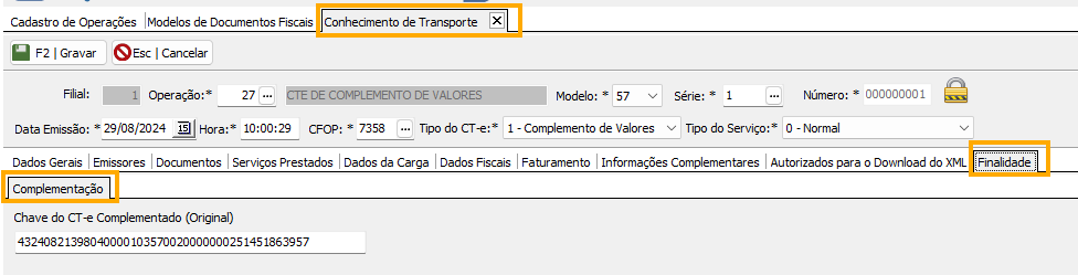 Ademais, após preencher as tributações, informe a chave do Ct-e de valor incorreto Finalidade > Complementação > Chave de CT-e Complementado (Original):