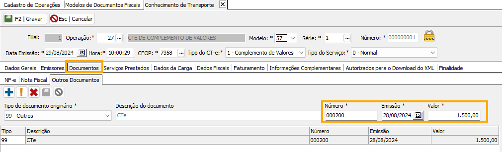 Lembre-se do Tipo de CT-e: Complemento de Valores.