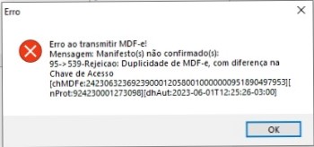 O erro estava ocorrendo pelo fato que o Manifesto já havia sido transmitido, por isso estava dando duplicidade. Só irá conseguir encerrar se tiver a chave do MDF-E e o Protocolo que são gerados após consultar a Nota pelo sistema, para assim gerar duas Chaves de Acesso, uma delas é a correta. Pelo link https://sso.acesso.gov.br/login?client_id=logincidadao.rs.gov.br&authorization_id=1888bc9a4b5 é necessário consultar o Manifesto, é obrigatório que seja consultado com o usúario GOV do Cliente, e assim finalizando o encerramento pela Chave ou corrigindo o MDF-E pelo XML.