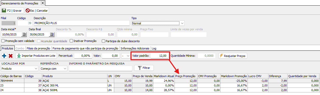 • Valor Padrão: Posso determinar um valor padrão para os produtos. Conforme abaixo:
