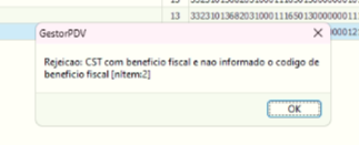 Rejeicao: CST com beneficio fiscal e não informado o código de beneficio fiscal [nItem:X]
