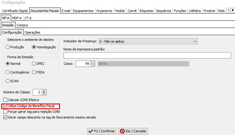 Passo 1: GESTORES> Utilitários> Configurações> Documentos Fiscais> Checkbox (Utiliza código com benefício).