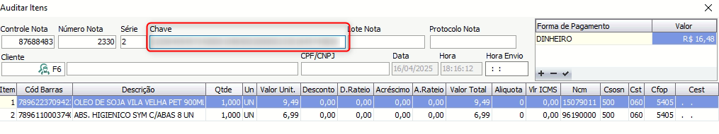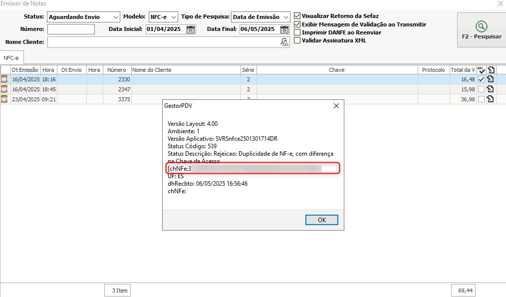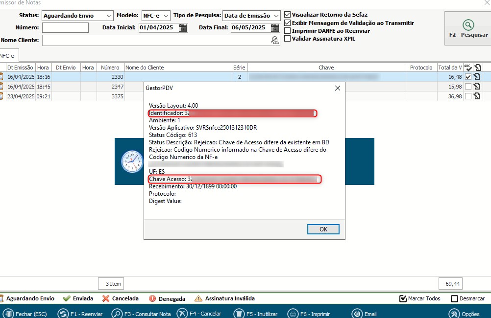 5. O sistema irá exibir a chave incorreta, abaixo segue destacada em vermelho: