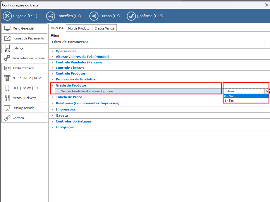 Esse parâmetro define se o sistema permitirá ou não a venda de produtos que utilizam grade (variações como tamanho, cor, numeração, etc.) quando não houver saldo disponível em estoque para aquela variação específica.