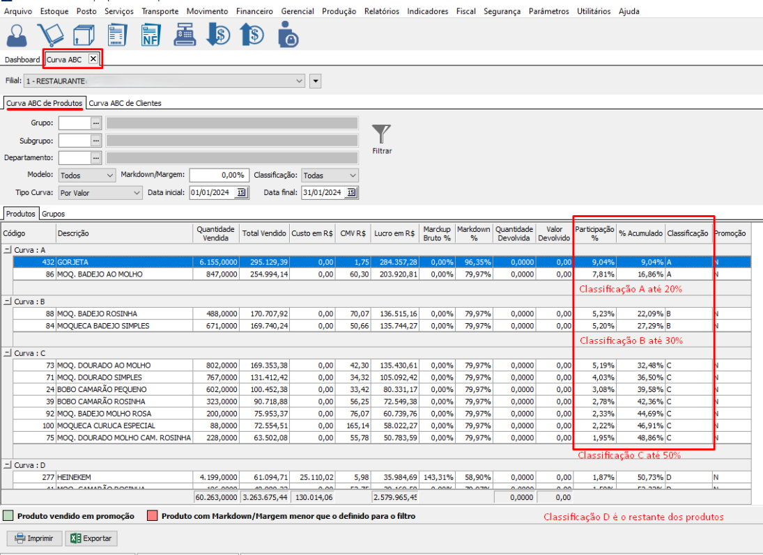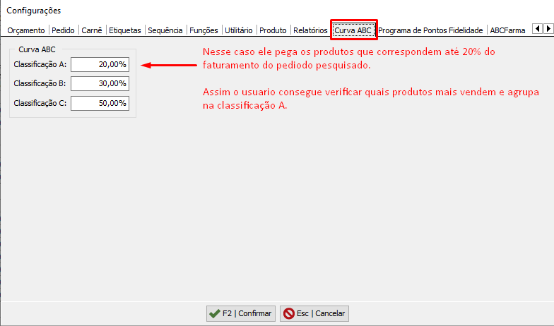 % Acumulado    = Soma as % de participação dos produtos até a quantidade configurada para cada classe.