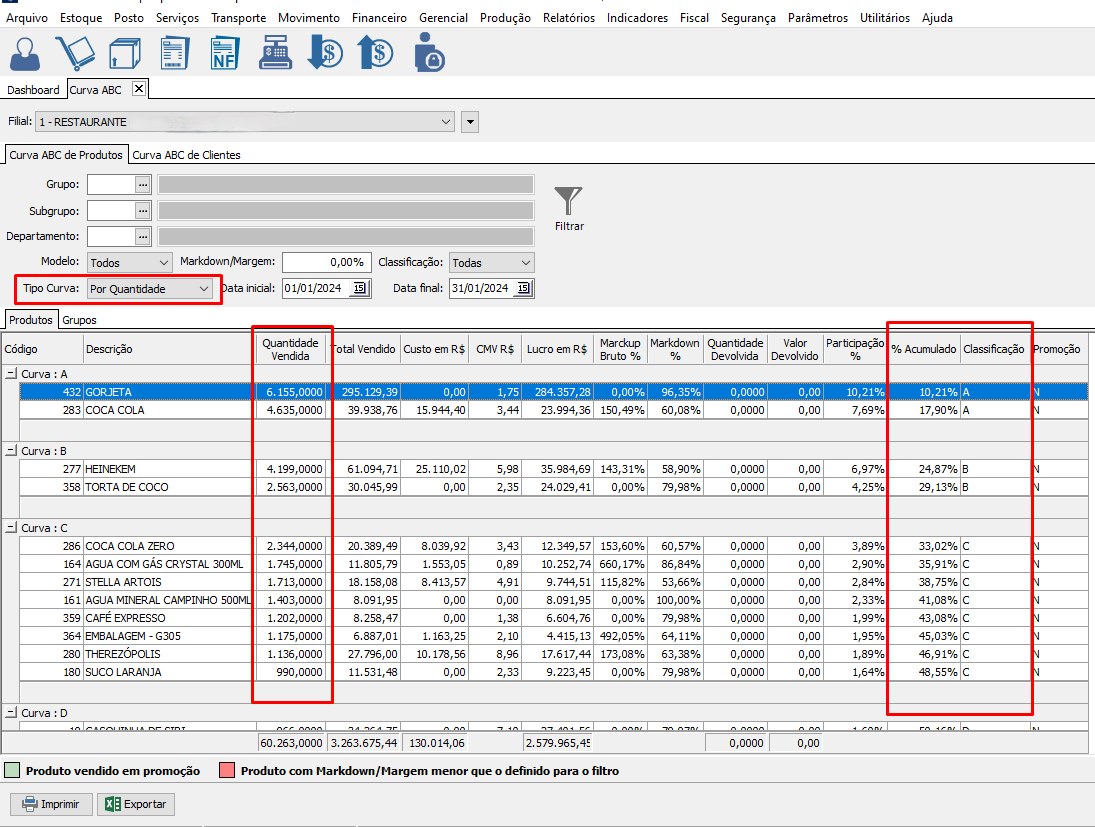 Curva ABC de Produtos - Tipo de Curva [Por Quantidade]