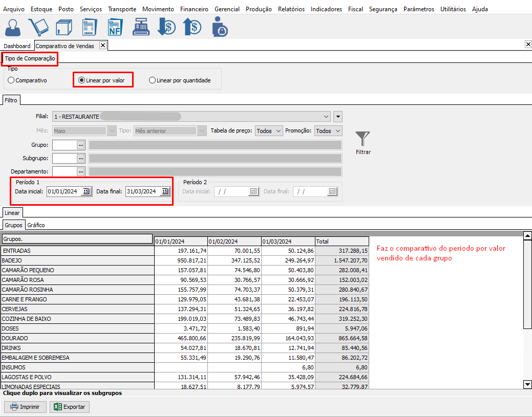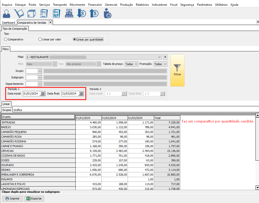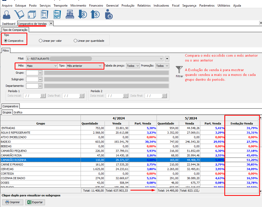 Esses relatórios podem segmentar as vendas por grupos de produtos, comparando quantidade, valor e participação de mercado.
