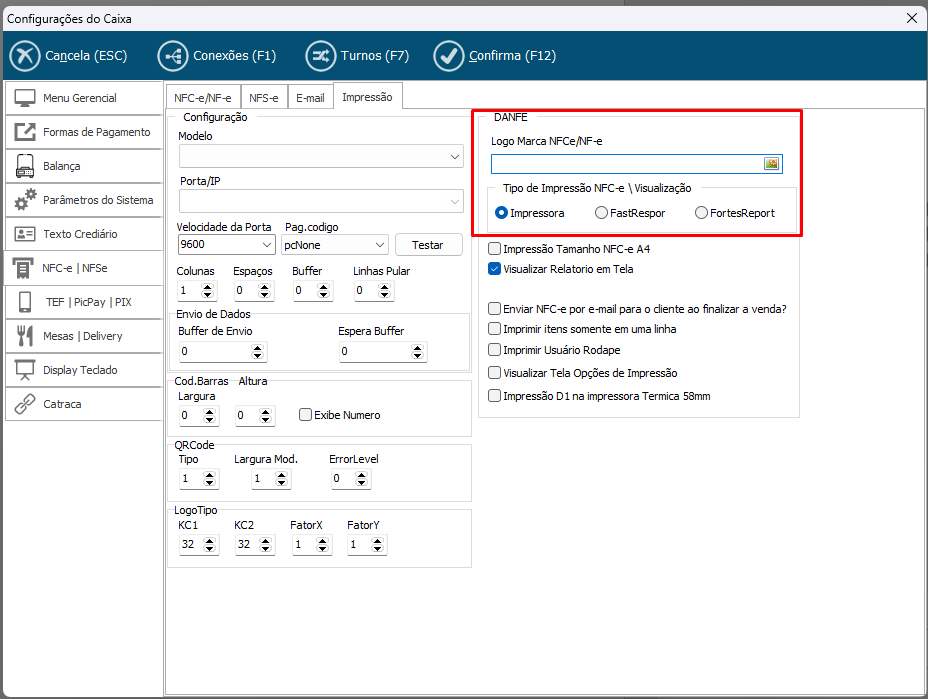 GestorPDV > Configurações do Caixa (Ctrl+C) > NFC-e|NFSe > Impressão > DANFE Logo Marca NFC-e/NFe