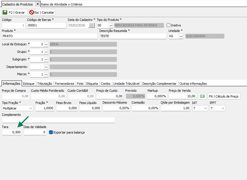 2. Após habilitá-los, na aba de Cadastro de produtos, será habilitado o campo de tara no canto inferior esquerdo, é necessário informar o valor correspondente ao peso conforme o prato utilizado no estabelecimento: