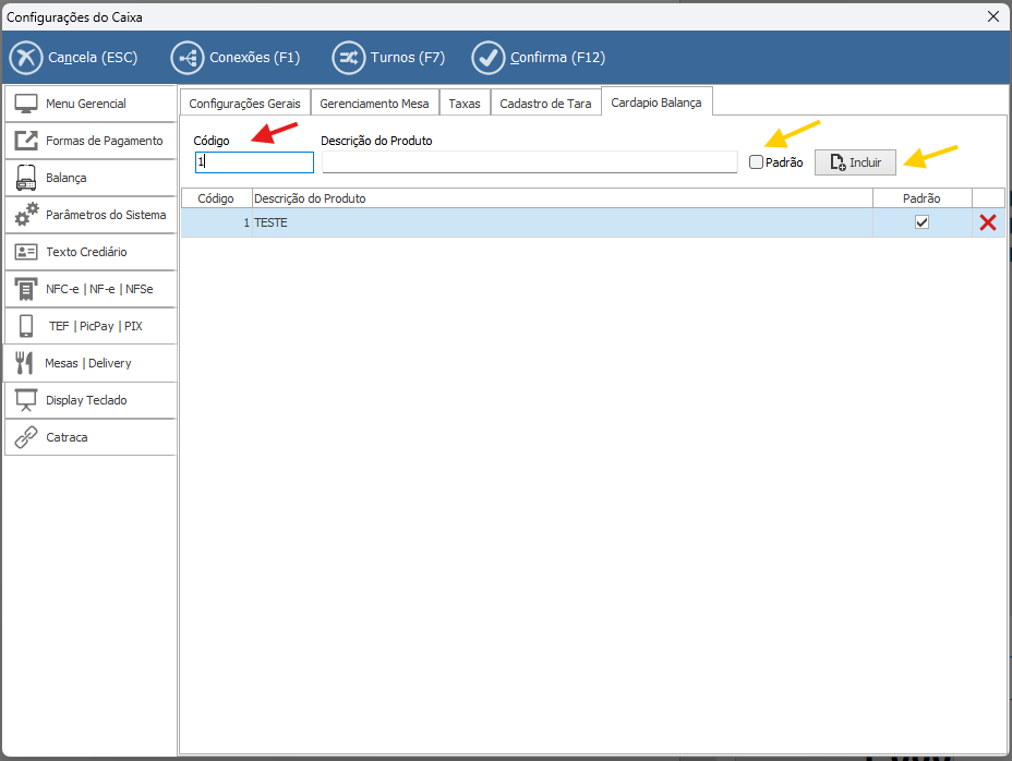 3. Partindo para o Gestor PDV, em: Configurações do sistema> Mesas I Delivery> Cardápio Balança. Adicionamos o produto informando o código e marcando o checkbox como padrão. Após a rotina, clicar em Incluir. O sistema irá informar o produto em tela em seguida: