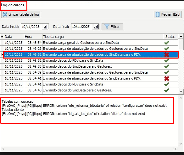 As vendas realizadas no PDV não estão sendo enviadas ao SincData devido aos erros abaixo, que indicam ausência de colunas no banco de dados.