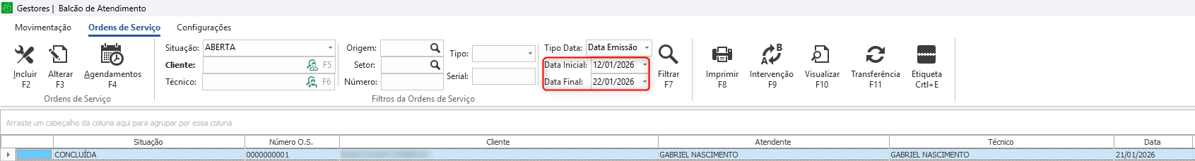 • Somente Ordens de Serviço dentro do período configurado serão listadas automaticamente.