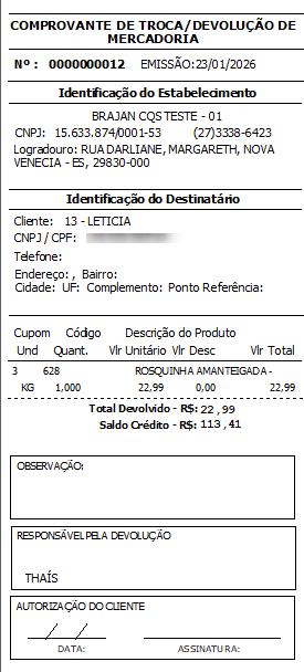 Ao realizar uma troca ou devolução de produtos, o sistema permite a emissão de um comprovante, contendo as informações da operação para controle interno e entrega ao cliente.