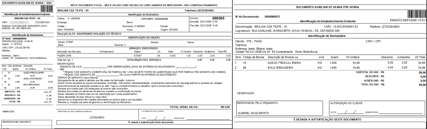 BALCÃO: VISUALIZAÇÃO DO DAV, PRÉ-VENDA E ORDEM DE SERVIÇO.