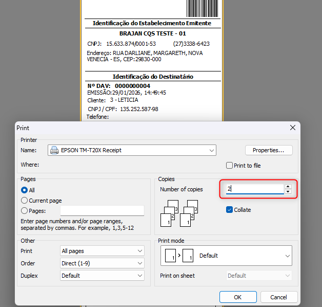 • A configuração não altera os dados da Pré-venda, apenas o número de cópias impressas.