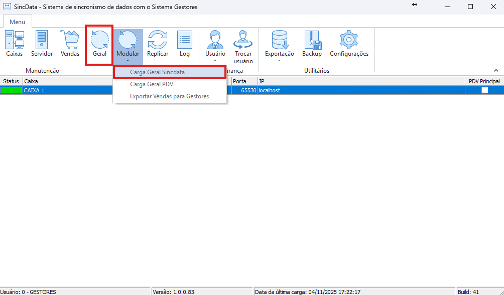 2º Vá em Modular -> Carga Geral Sincdata no sincdata na seguinte ordem.