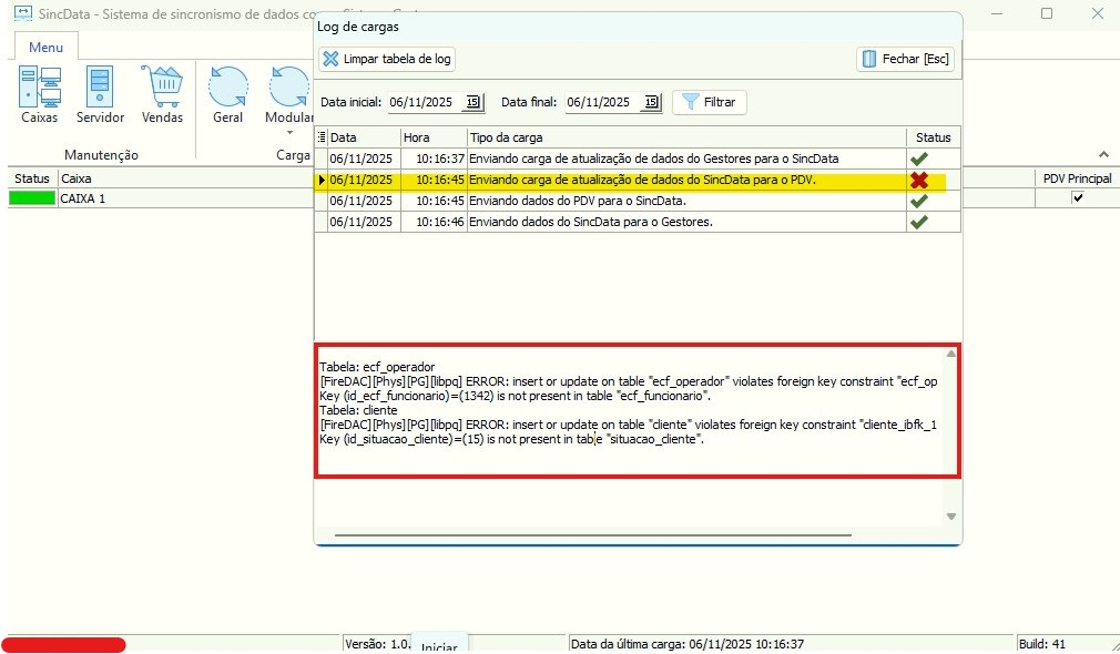 Para corrigir esse erro é necessário verificar se foi realizado a carga Geral, no sincdata, a fim de enviar todas as informações para o banco do Gestor PDV.
