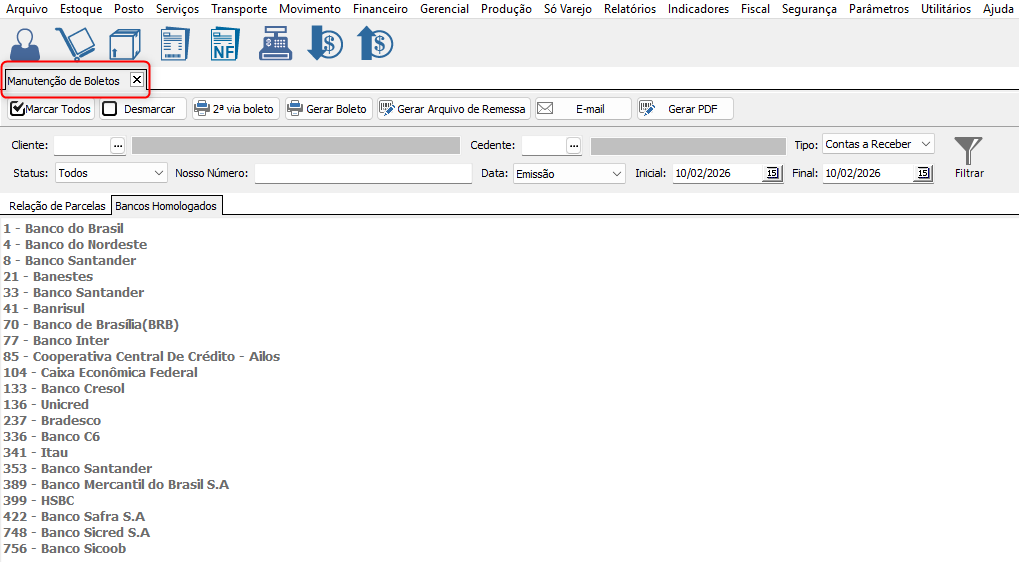 No Gestores > Financeiro > Banco > Manutenção de Boletos, na aba Bancos Homologados, é possível consultar a lista de bancos homologados pelo sistema para emissão de boletos, como: