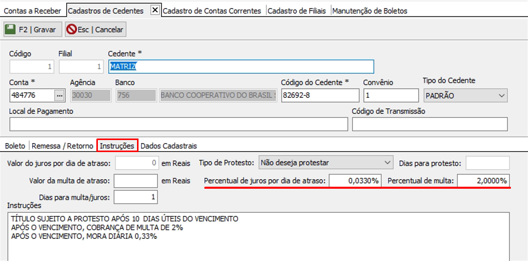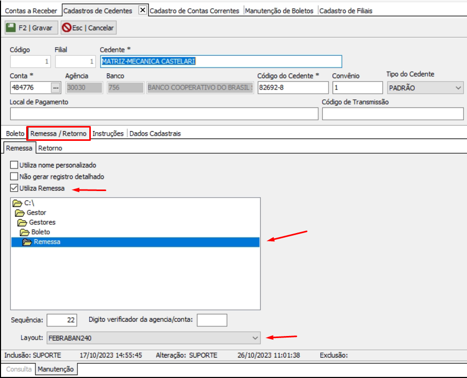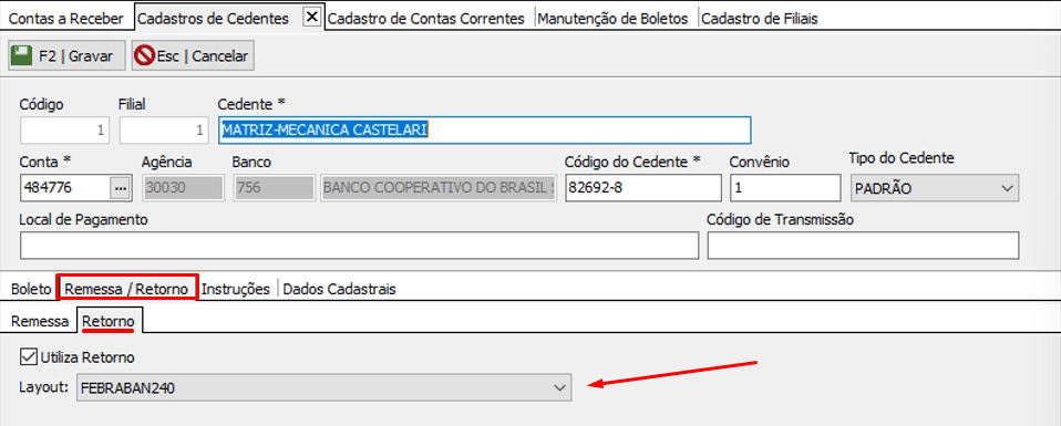 1.3 Cadastro de Cedente (Remessa/Retorno)