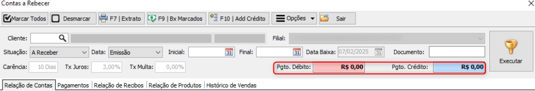 Ao definir esse parâmetro como NÃO, os campos Pgto. Débito e Pgto. Crédito serão habilitados automaticamente na tela de Contas a Receber.
